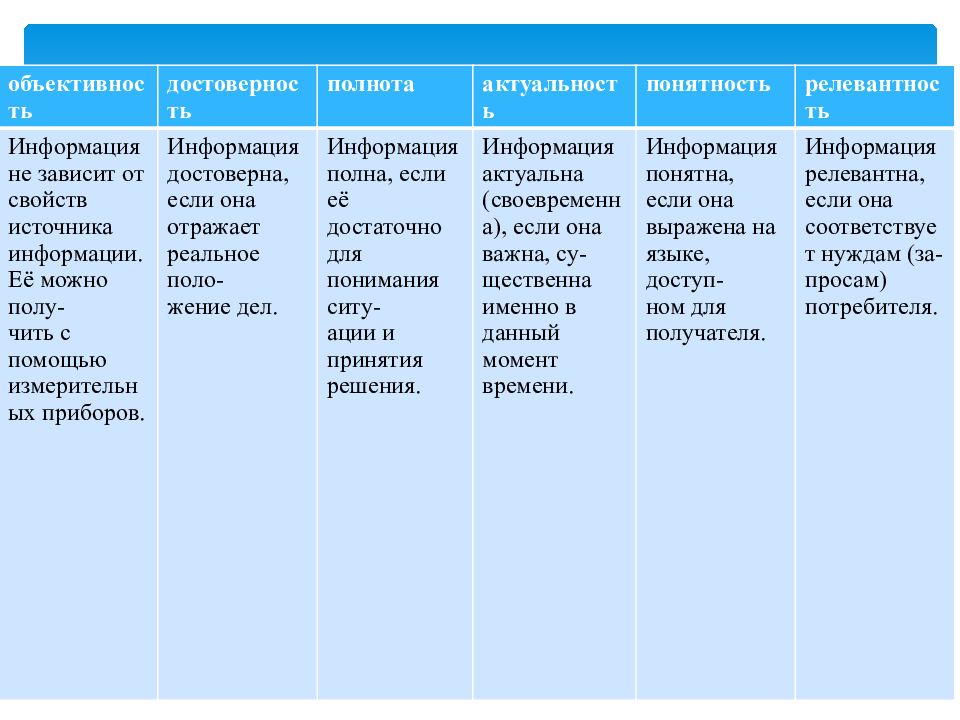 объективность достоверность полнота актуальность понятность релевантность Информация не зависит от свойств источника информации. Её можно полу- чить с помощью измерительных приборов. Информация достоверна, если она отражает реальное поло- жение дел. Информация полна, если её достаточно для понимания ситу- ации и принятия решения. Информация актуальна (своевременна), если она важна, су- щественна именно в данный момент времени. Информация понятна, если она выражена на языке, доступ- ном для получателя. Информация релевантна, если она соответствует нуждам (за- просам ) потребителя.
