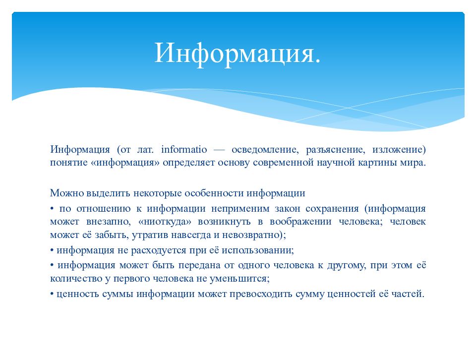 Информация (от лат. informatio — осведомление, разъяснение, изложение) понятие «информация» определяет основу современной научной картины мира. Можно выделить некоторые особенности информации • по отношению к информации неприменим закон сохранения (информация может внезапно, «ниоткуда» возникнуть в воображении человека; человек может её забыть, утратив навсегда и невозвратно); • информация не расходуется при её использовании; • информация может быть передана от одного человека к другому, при этом её количество у первого человека не уменьшится; • ценность суммы информации может превосходить сумму ценностей её частей. Информация.