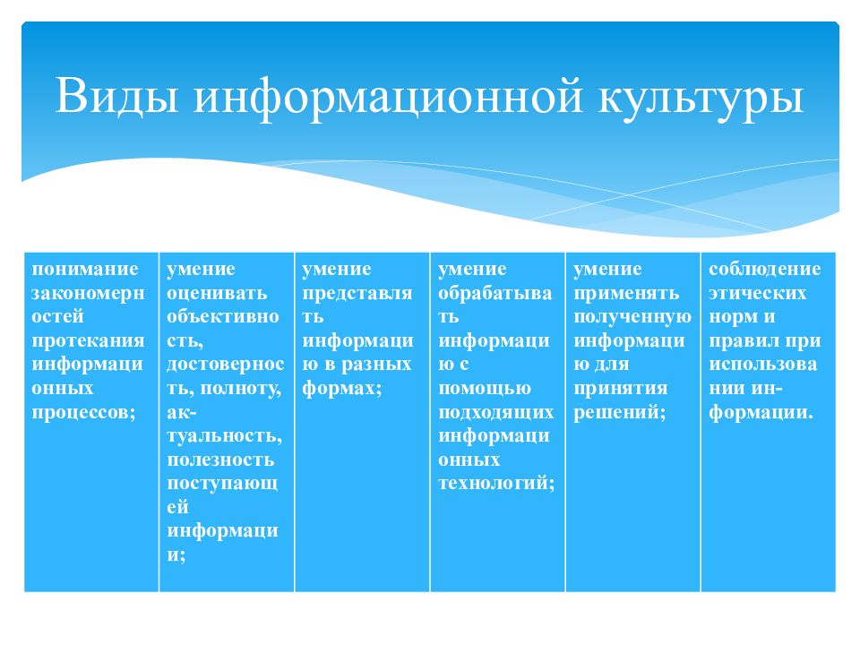 понимание закономерностей протекания информационных процессов; умение оценивать объективность, достоверность, полноту, ак - туальность, полезность поступающей информации; умение представлять информацию в разных формах; умение обрабатывать информацию с помощью подходящих информационных технологий; умение применять полученную информацию для принятия решений; соблюдение этических норм и правил при использовании ин- формации. Виды информационной культуры