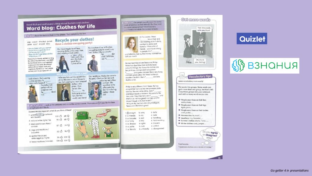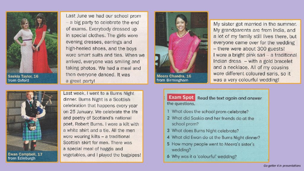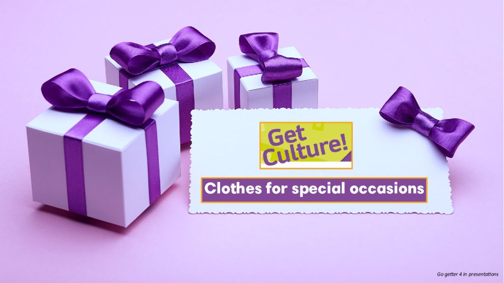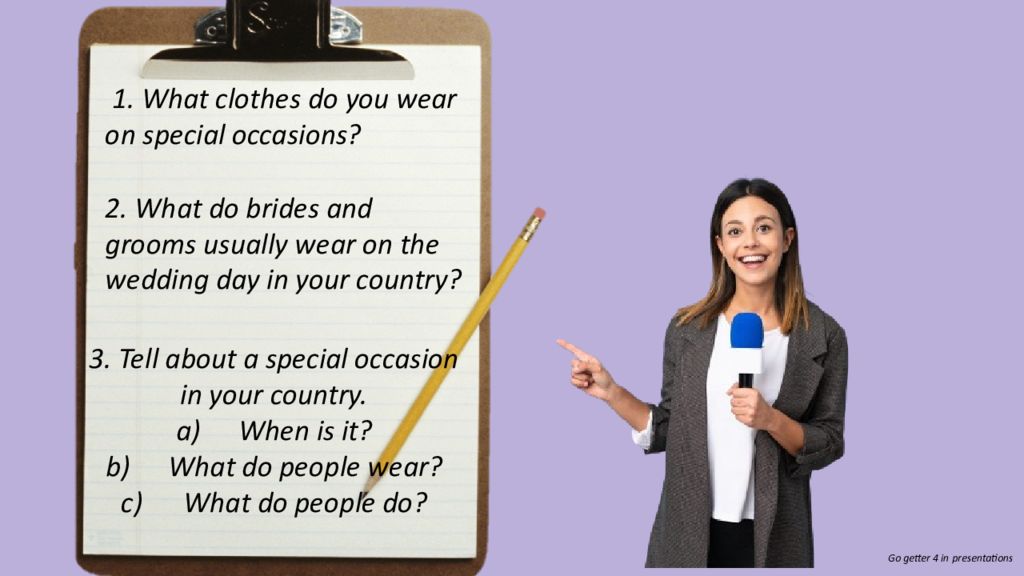 1. What clothes do you wear on special occasions? 2. What do brides and grooms usually wear on the wedding day in your country? 3. Tell about a special occasion in your country. When is it? What do people wear? What do people do? Go getter 4 in presentations