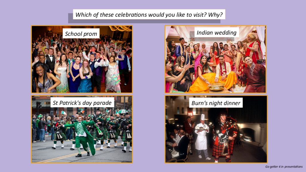 Which of these celebrations would you like to visit? Why? School prom Indian wedding St Patrick's day parade Burn’s night dinner Go getter 4 in presentations