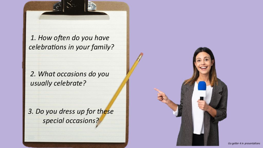 1. How often do you have celebrations in your family? 2. What occasions do you usually celebrate? 3. Do you dress up for these special occasions? Go getter 4 in presentations