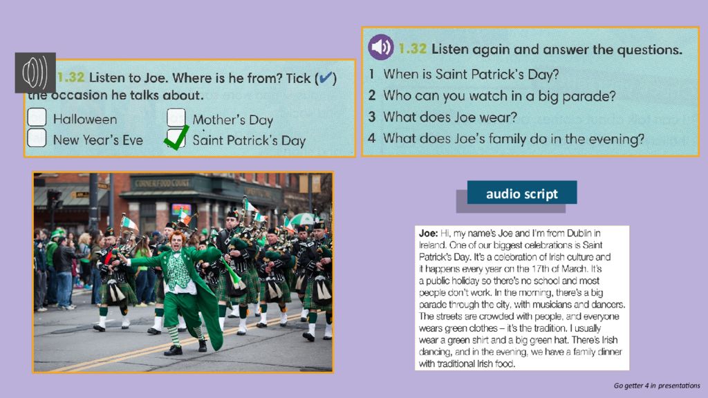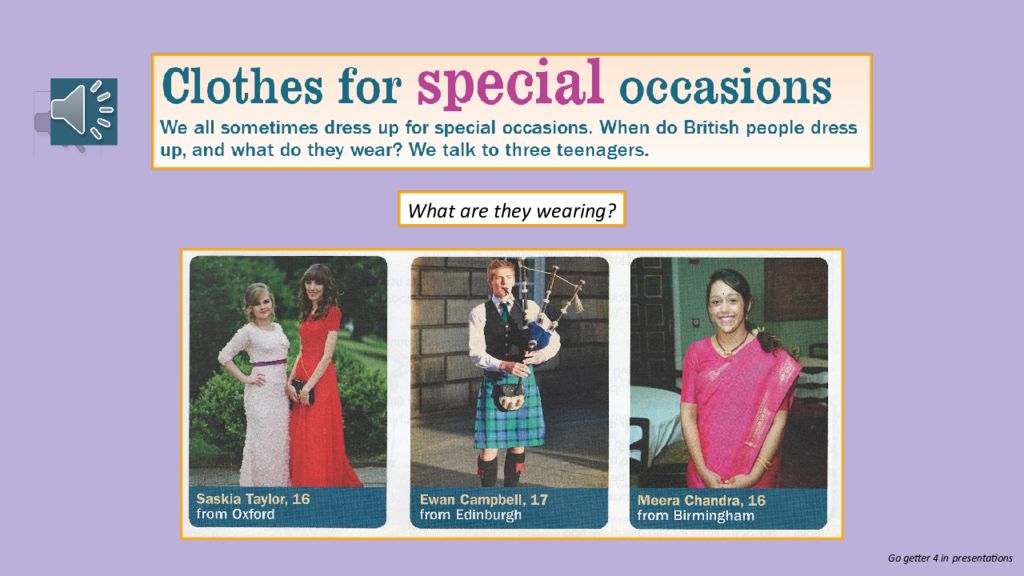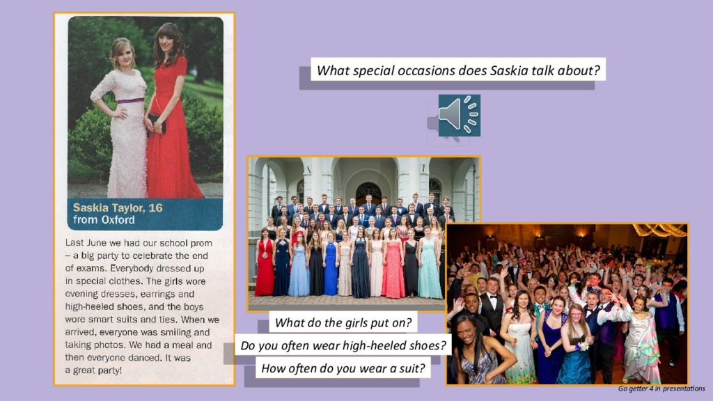What special occasions does Saskia talk about? What do the girls put on? Do you often wear high-heeled shoes? How often do you wear a suit? Go getter 4 in presentations