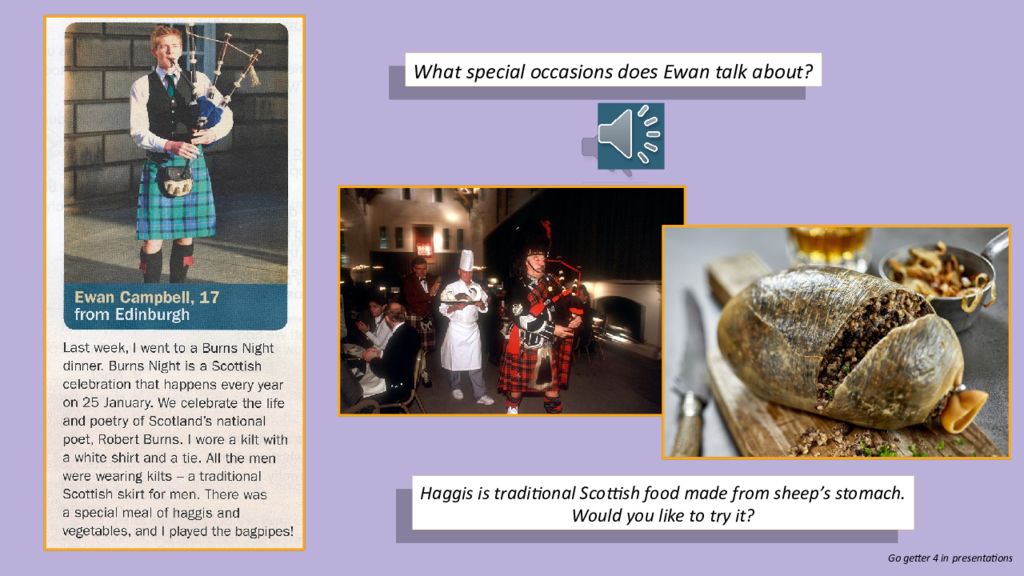 What special occasions does Ewan talk about? Haggis is traditional Scottish food made from sheep’s stomach. Would you like to try it? Go getter 4 in presentations