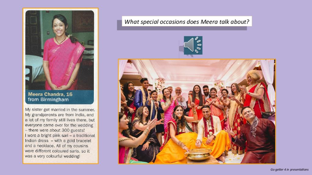 What special occasions does Meera talk about? Go getter 4 in presentations