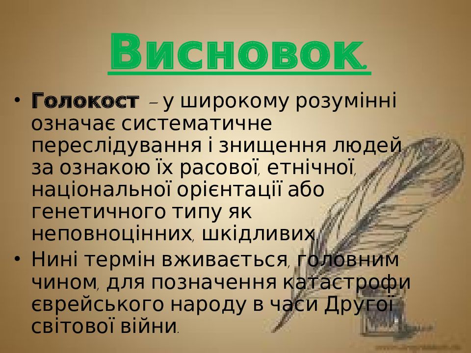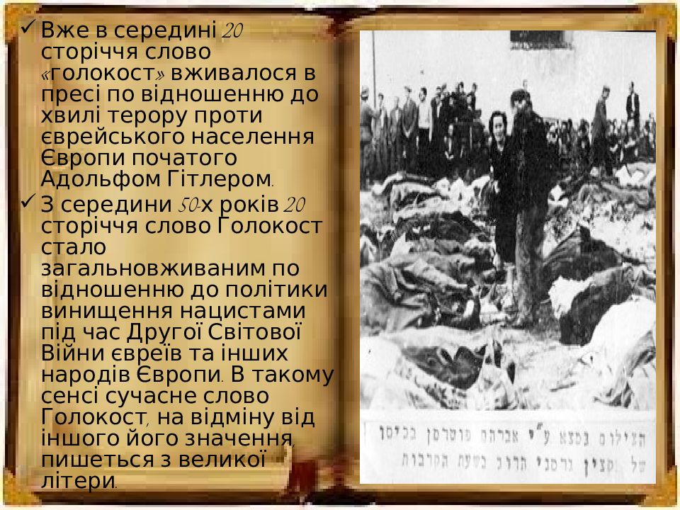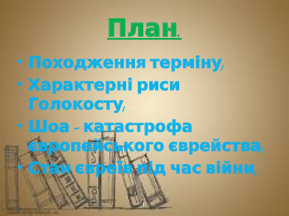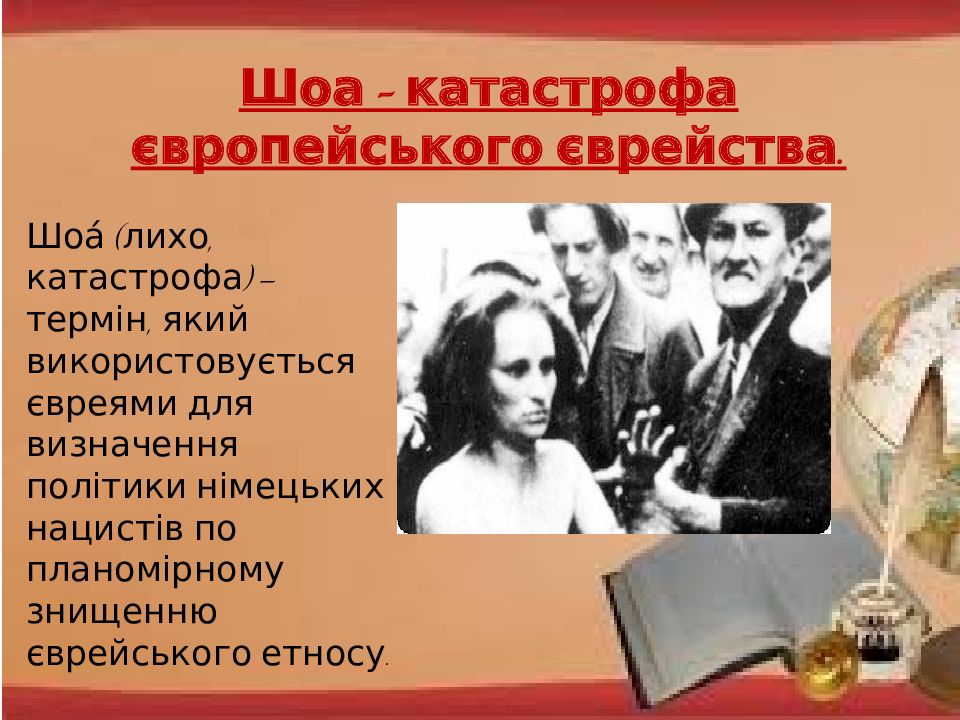 Походження терміну; Характерні риси Голокосту; Шоа – катастрофа європейського єврейства; Стан євреїв під час війни;