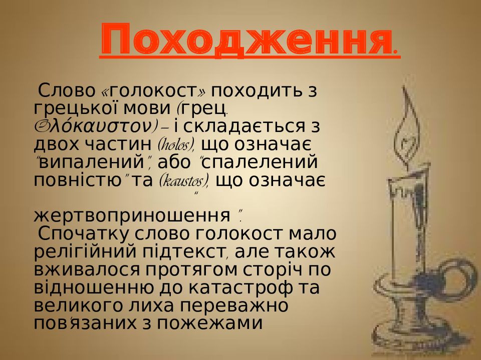 Походження. Слово «голокост» походить з грецької мови ( грец. Oλόκαυστον ) — і складається з двох частин ( holos ), що означає “випалений”, або “ спалелений повністю” та ( kaustos ), що означає “ жертвоприношення ”. Спочатку слово голокост мало релігійний підтекст, але також вживалося протягом сторіч по відношенню до катастроф та великого лиха переважно пов'язаних з пожежами