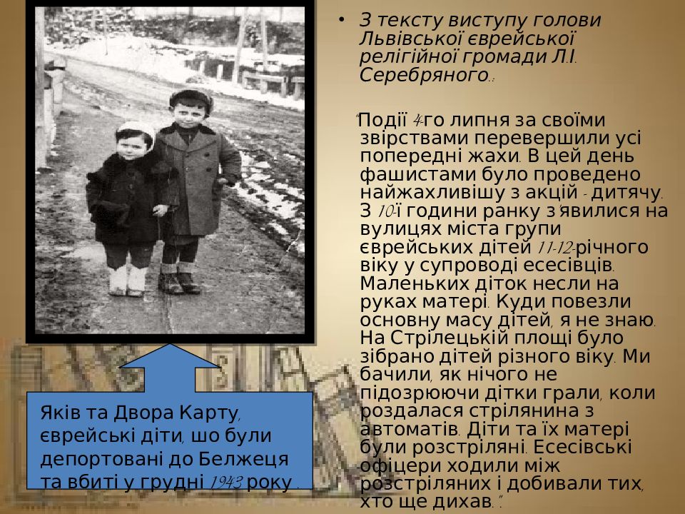 З тексту виступу голови Львівської єврейської релігійної громади Л.І. Серебряного.: “ Події 4-го липня за своїми звірствами перевершили усі попередні жахи. В цей день фашистами було проведено найжахливішу з акцій - дитячу. З 10-ї години ранку з’явилися на вулицях міста групи єврейських дітей 11-12-річного віку у супроводі есесівців. Маленьких діток несли на руках матері. Куди повезли основну масу дітей, я не знаю. На Стрілецькій площі було зібрано дітей різного віку. Ми бачили, як нічого не підозрюючи дітки грали, коли роздалася стрілянина з автоматів. Діти та їх матері були розстріляні. Есесівські офіцери ходили між розстріляних і добивали тих, хто ще дихав.”. Яків та Двора Карту, єврейські діти, шо були депортовані до Белжеця та вбиті у грудні 1943 року.