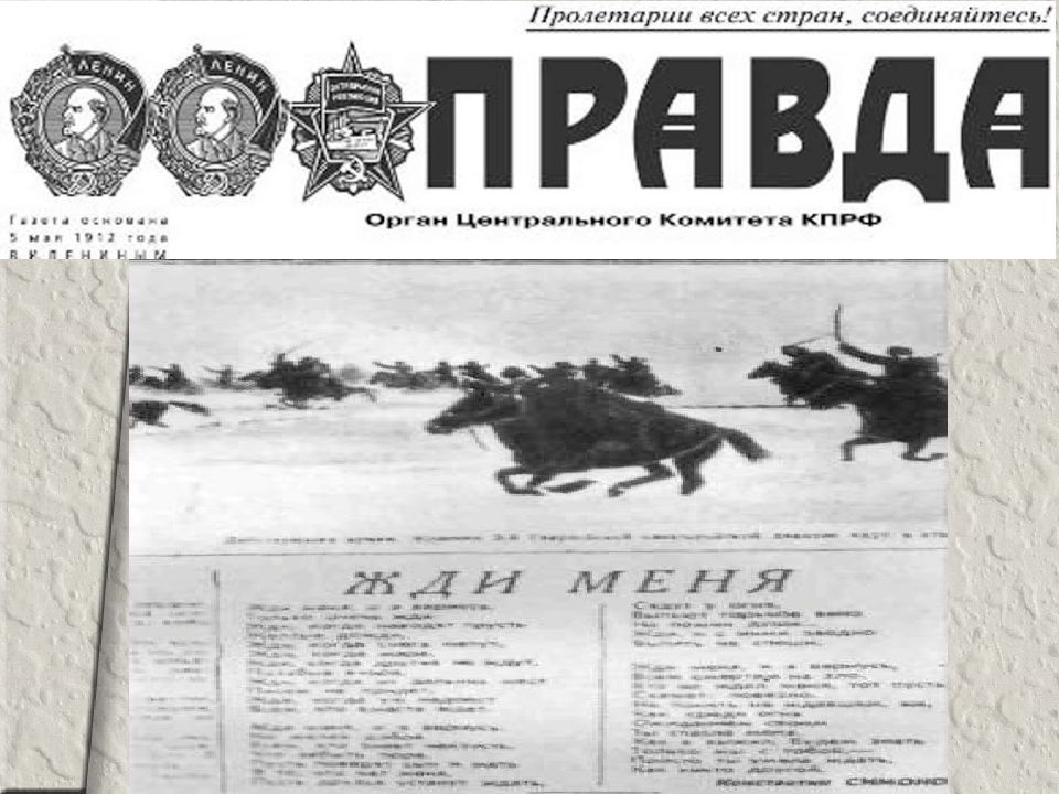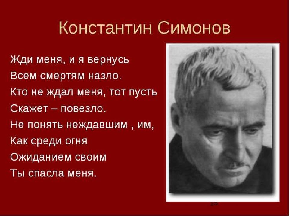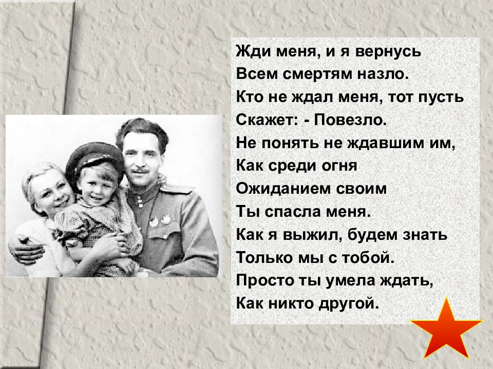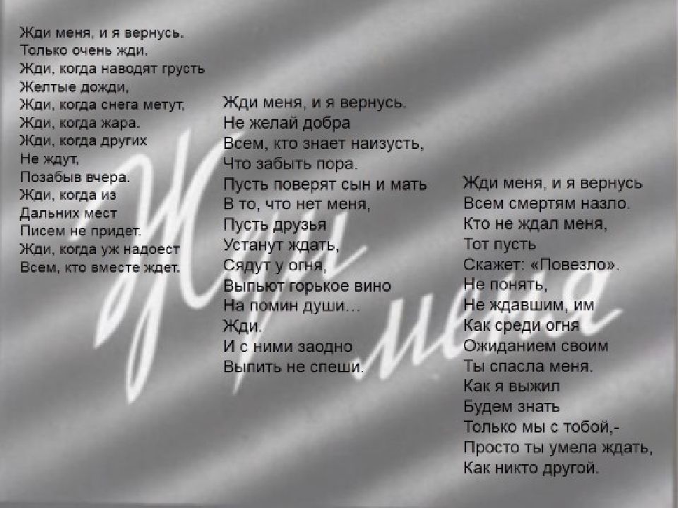 Жди меня, и я вернусь Всем смертям назло. Кто не ждал меня, тот пусть Скажет: - Повезло. Не понять не ждавшим им, Как среди огня Ожиданием своим Ты спасла меня. Как я выжил, будем знать Только мы с тобой. Просто ты умела ждать, Как никто другой.
