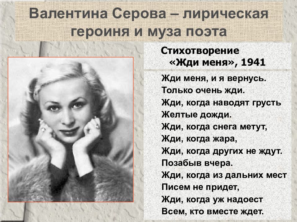 Валентина Серова – лирическая героиня и муза поэта Жди меня, и я вернусь. Только очень жди. Жди, когда наводят грусть Желтые дожди. Жди, когда снега метут, Жди, когда жара, Жди, когда других не ждут. Позабыв вчера. Жди, когда из дальних мест Писем не придет, Жди, когда уж надоест Всем, кто вместе ждет. Стихотворение «Жди меня», 1941