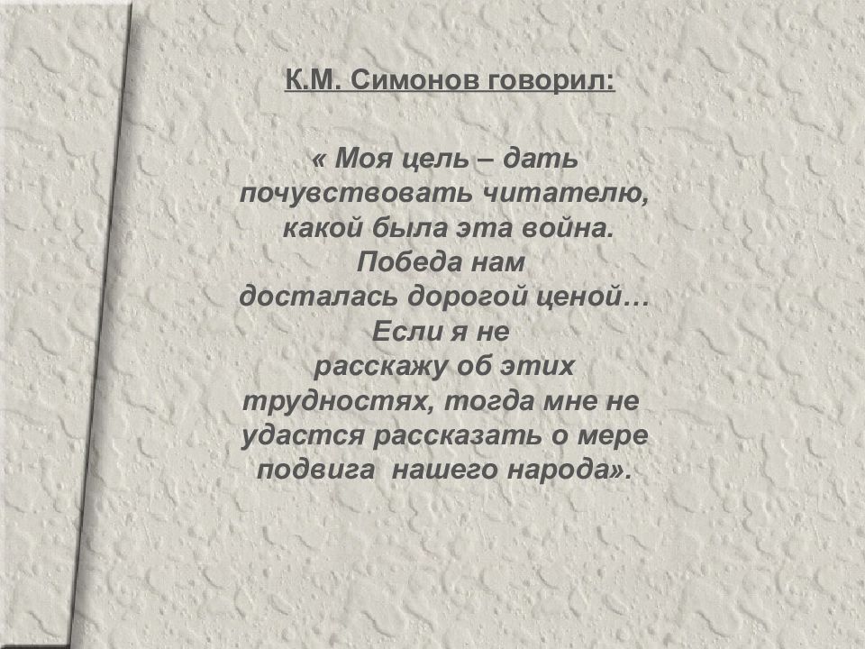 « Моя цель – дать почувствовать читателю, какой была эта война. Победа нам досталась дорогой ценой… Если я не расскажу об этих трудностях, тогда мне не удастся рассказать о мере подвига нашего народа». К.М. Симонов говорил: