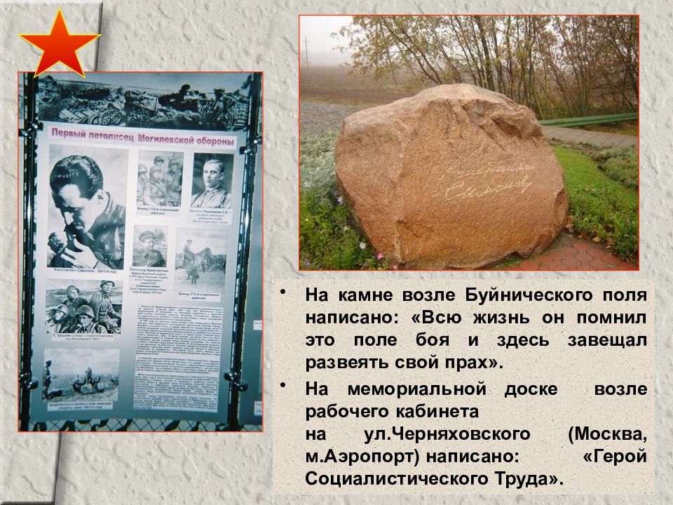 На камне возле Буйнического поля написано: «Всю жизнь он помнил это поле боя и здесь завещал развеять свой прах». На мемориальной доске возле рабочего кабинета на ул.Черняховского (Москва, м.Аэропорт) написано: «Герой Социалистического Труда».