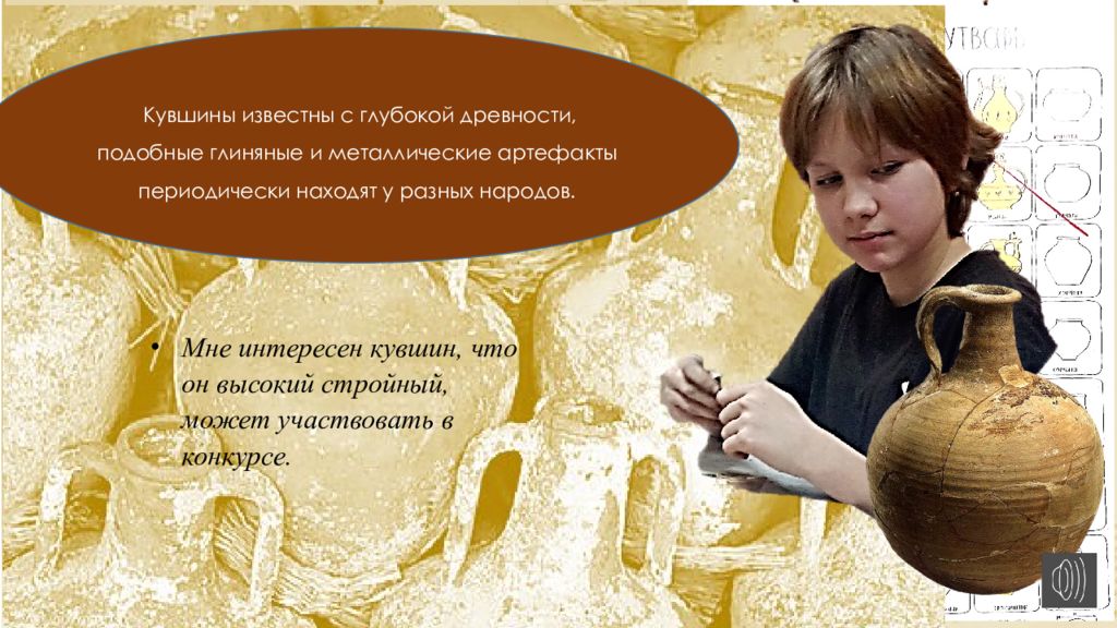 Мне интересен кувшин, что он высокий стройный, может участвовать в конкурсе. Кувшины известны с глубокой древности, подобные глиняные и металлические артефакты периодически находят у разных народов.