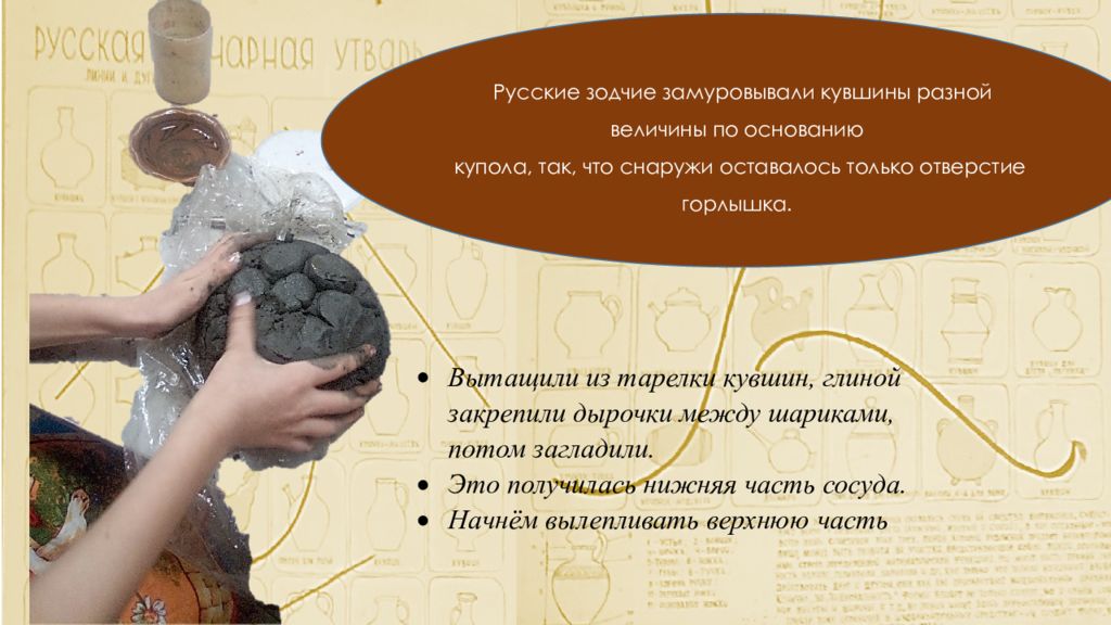 Вытащили из тарелки кувшин, глиной закрепили дырочки между шариками, потом загладили. Это получилась нижняя часть сосуда. Начнём вылепливать верхнюю часть Русские зодчие замуровывали кувшины разной величины по основанию купола, так, что снаружи оставалось только отверстие горлышка.
