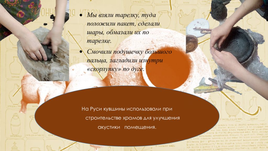Мы взяли тарелку, туда положили пакет, сделали шары, обмазали их по тарелке. Смочили подушечку большого пальца, загладили изнутри «скорлупку» по дуге. На Руси кувшины использовали при строительстве храмов для улучшения акустики помещения.