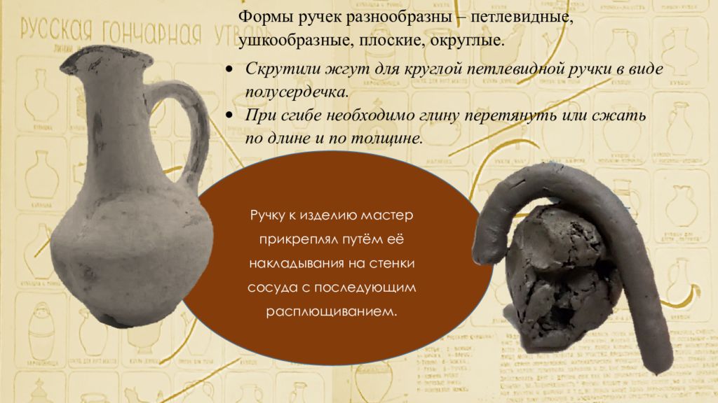 Формы ручек разнообразны – петлевидные, ушкообразные, плоские, округлые. Скрутили жгут для круглой петлевидной ручки в виде полусердечка. При сгибе необходимо глину перетянуть или сжать по длине и по толщине. Ручку к изделию мастер прикреплял путём её накладывания на стенки сосуда с последующим расплющиванием.