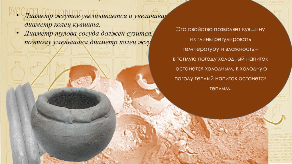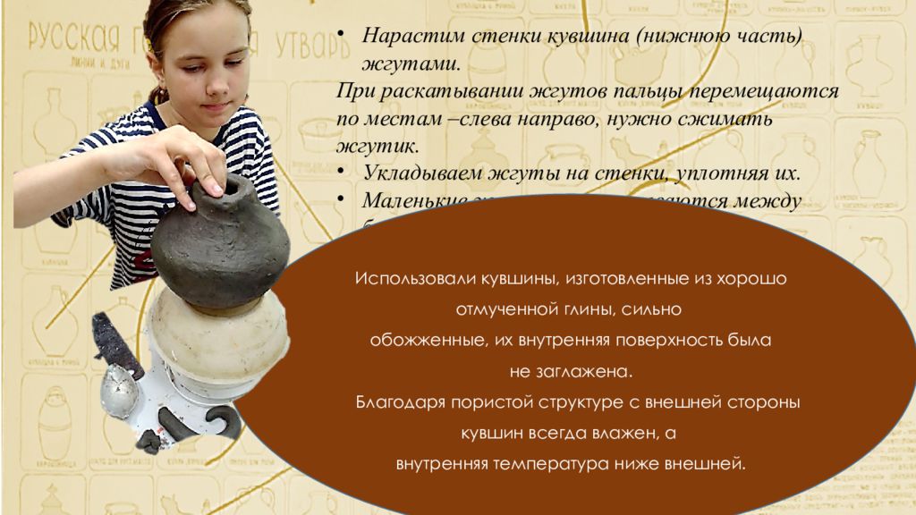 Нарастим стенки кувшина (нижнюю часть) жгутами. При раскатывании жгутов пальцы перемещаются по местам –слева направо, нужно сжимать жгутик. Укладываем жгуты на стенки, уплотняя их. Маленькие жгутики примазываются между большими, . Использовали кувшины, изготовленные из хорошо отмученной глины, сильно обожженные, их внутренняя поверхность была не заглажена. Благодаря пористой структуре с внешней стороны кувшин всегда влажен, а внутренняя температура ниже внешней.