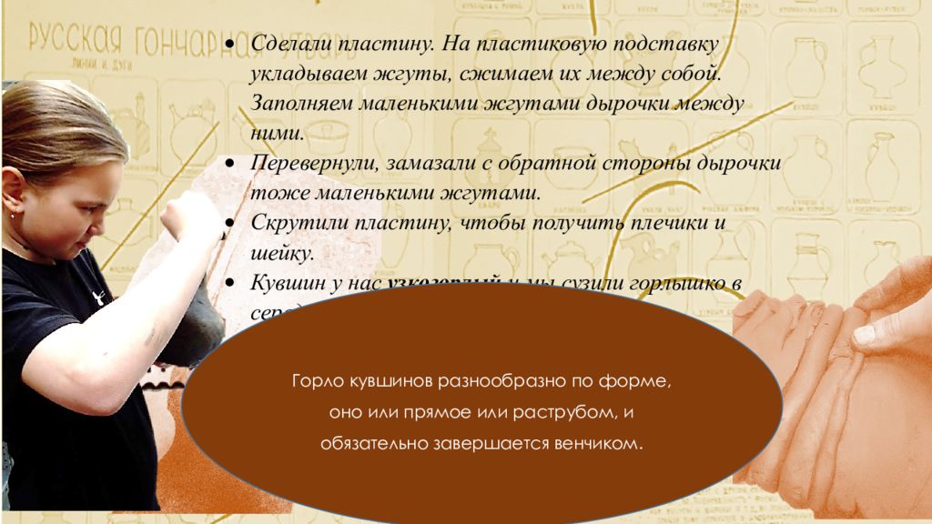 Сделали пластину. На пластиковую подставку укладываем жгуты, сжимаем их между собой. Заполняем маленькими жгутами дырочки между ними. Перевернули, замазали с обратной стороны дырочки тоже маленькими жгутами. Скрутили пластину, чтобы получить плечики и шейку. Кувшин у нас узкогорлый и мы сузили горлышко в середине и вверху – обточили ножиком. Горло кувшинов разнообразно по форме, оно или прямое или раструбом, и обязательно завершается венчиком.