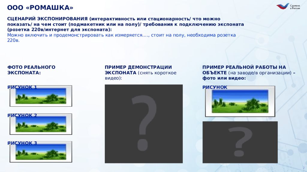 СЦЕНАРИЙ ЭКСПОНИРОВАНИЯ ( интерактивность или стационарность/ что можно показать/ на чем стоит (подмакетник или на полу)/ требования к подключению экспоната (розетка 220в/интернет для экспоната): Можно включить и продемонстрировать как измеряется…., стоит на полу, необходима розетка 220в. ФОТО РЕАЛЬНОГО ЭКСПОНАТА : ПРИМЕР ДЕМОНСТРАЦИИ ЭКСПОНАТА (снять короткое видео) : ПРИМЕР РЕАЛЬНОЙ РАБОТЫ НА ОБЪЕКТЕ (на заводе/в организации) – фото или видео : ООО «РОМАШКА» 2