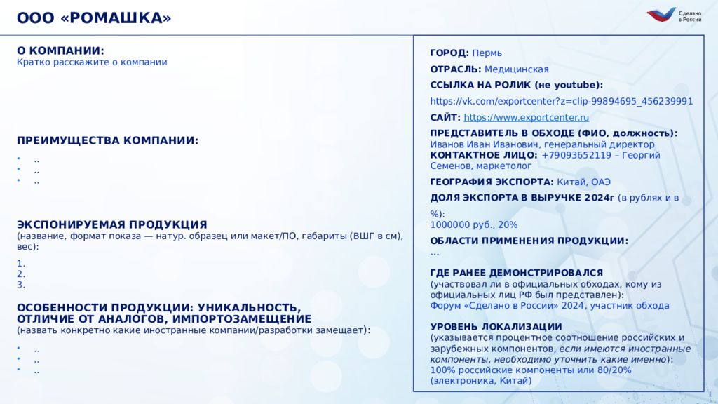 ГОРОД: Пермь ОТРАСЛЬ: Медицинская ССЫЛКА НА РОЛИК (не youtube ): https://vk.com/exportcenter?z=clip-99894695_456239991 САЙТ: https://www.exportcenter.ru ПРЕДСТАВИТЕЛЬ В ОБХОДЕ (ФИО, должность): Иванов Иван Иванович, генеральный директор КОНТАКТНОЕ ЛИЦО: +79093652119 – Георгий Семенов, маркетолог ГЕОГРАФИЯ ЭКСПОРТА: Китай, ОАЭ ДОЛЯ ЭКСПОРТА В ВЫРУЧКЕ 2024г (в рублях и в %) : 10 0 0000 руб., 20 % ОБЛАСТИ ПРИМЕНЕНИЯ ПРОДУКЦИИ: … ГДЕ РАНЕЕ ДЕМОНСТРИРОВАЛСЯ ( участвовал ли в официальных обходах, кому из официальных лиц РФ был представлен ) : Форум «Сделано в России» 2024, участник обхода УРОВЕНЬ ЛОКАЛИЗАЦИИ (указывается процентное соотношение российских и зарубежных компонентов, если имеются иностранные компоненты, необходимо уточнить какие именно ): 100 % российские компоненты или 80/20% (электроника, Китай) ООО «РОМАШКА» О КОМПАНИИ : Кратко расскажите о компании ПРЕИМУЩЕСТВА КОМПАНИИ: .. .. .. ЭКСПОНИРУЕМАЯ ПРОДУКЦИЯ (название, формат показа — натур. образец или макет/ПО, габариты (ВШГ в см), вес): 1. 2. 3. ОСОБЕННОСТИ ПРОДУКЦИИ: УНИКАЛЬНОСТЬ, ОТЛИЧИЕ ОТ АНАЛОГОВ, ИМПОРТОЗАМЕЩЕНИЕ (назвать конкретно какие иностранные компании/разработки замещает ): .. .. .. 1