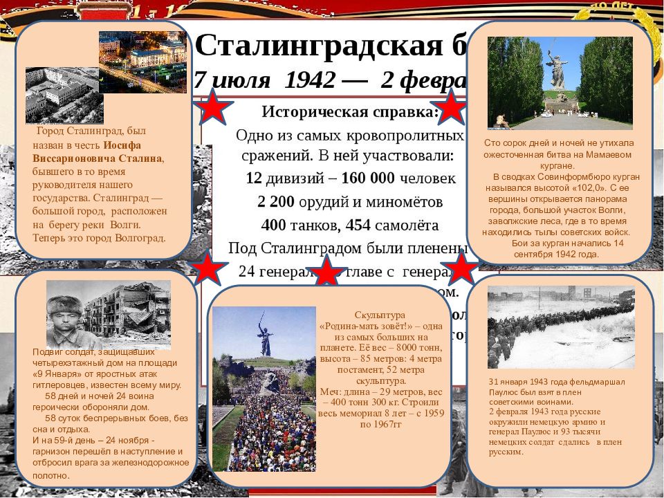 Город Сталинград, был назван в честь Иосифа Виссарионовича Сталина, бывшего в то время руководителя нашего государства. Сталинград — большой город, расположен на берегу реки Волги. Теперь это город Волгоград. Подвиг солдат, защищавших четырехэтажный дом на площади «9 Января» от яростных атак гитлеровцев, известен всему миру. 58 дней и ночей 24 воина героически обороняли дом. 58 суток беспрерывных боев, без сна и отдыха. И на 59-й день – 24 ноября - гарнизон перешёл в наступление и отбросил врага за железнодорожное полотно. Сто сорок дней и ночей не утихала ожесточенная битва на Мамаевом кургане. В сводках Совинформбюро курган назывался высотой «102,0». С ее вершины открывается панорама города, большой участок Волги, заволжские леса, где в то время находились тылы советских войск. Бои за курган начались 14 сентября 1942 года. 31 января 1943 года фельдмаршал Паулюс был взят в плен советскими воинами. 2 февраля 1943 года русские окружили немецкую армию и генерал Паулюс и 93 тысячи немецких солдат сдались в плен русским. Скульптура « Родина-мать зовёт!» – одна из самых больших на планете. Её вес – 8000 тонн, высота – 85 метров: 4 метра постамент, 52 метра скульптура. Меч: длина – 29 метров, вес – 400 тонн 300 кг. Строили весь мемориал 8 лет – с 1959 по 1967гг