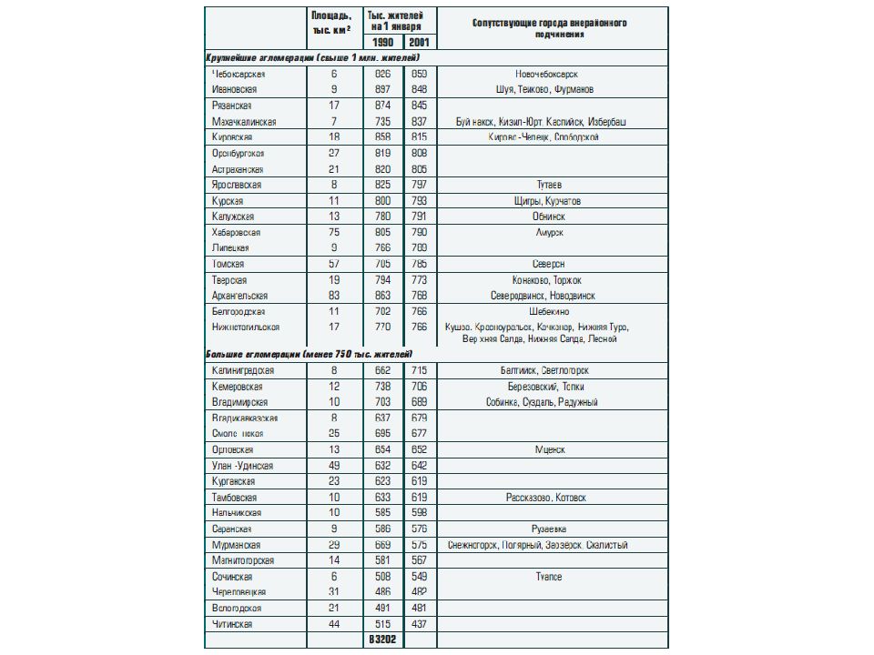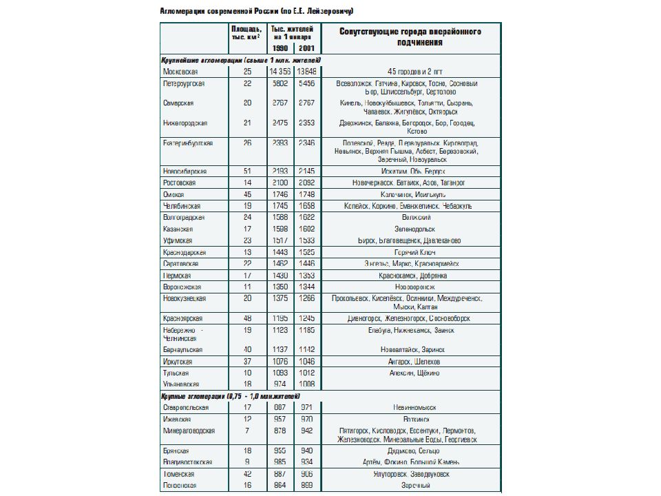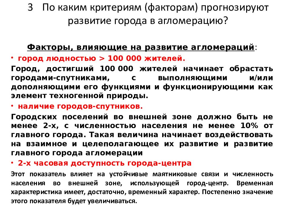 Факторы, влияющие на развитие агломераций : город людностью > 100 000 жителей. Город, достигший 100 000 жителей начинает обрастать городами-спутниками, с выполняющими и/или дополняющими его функциями и функционирующими как элемент техногенной природы. наличие городов-спутников. Городских поселений во внешней зоне должно быть не менее 2-х, с численностью населения не менее 10% от главного города. Такая величина начинает воздействовать на взаимное и целеполагающее их развитие и развитие главного города агломерации 2-х часовая доступность города-центра Этот показатель влияет на устойчивые маятниковые связи и численность населения во внешней зоне, использующей город-центр. Временная характеристика имеет, достаточно, временный характер. Постепенно значение этого показателя будет увеличиваться.