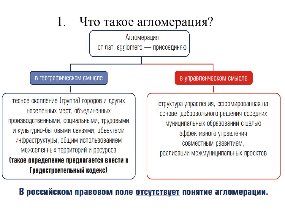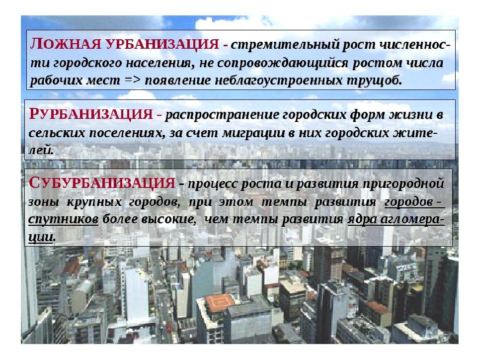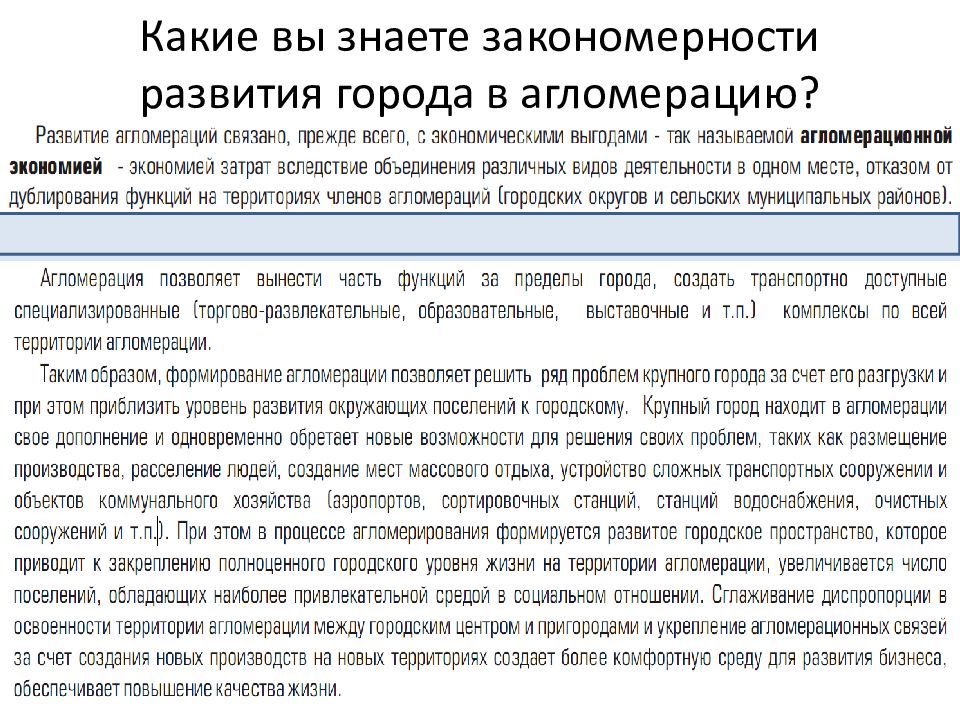 Расположенные рядом города и пригороды начинают постепенно сближаться, создавать единое экономическое, транспортное, социальное, культурное пространство. Этот процесс получил название « агломерирование ».