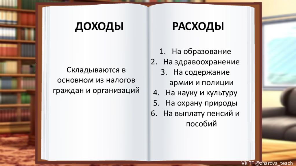 ДОХОДЫ РАСХОДЫ Складываются в основном из налогов граждан и организаций На образование На здравоохранение На содержание армии и полиции На науку и культуру На охрану природы На выплату пенсий и пособий VK ТГ @zharova _ teach