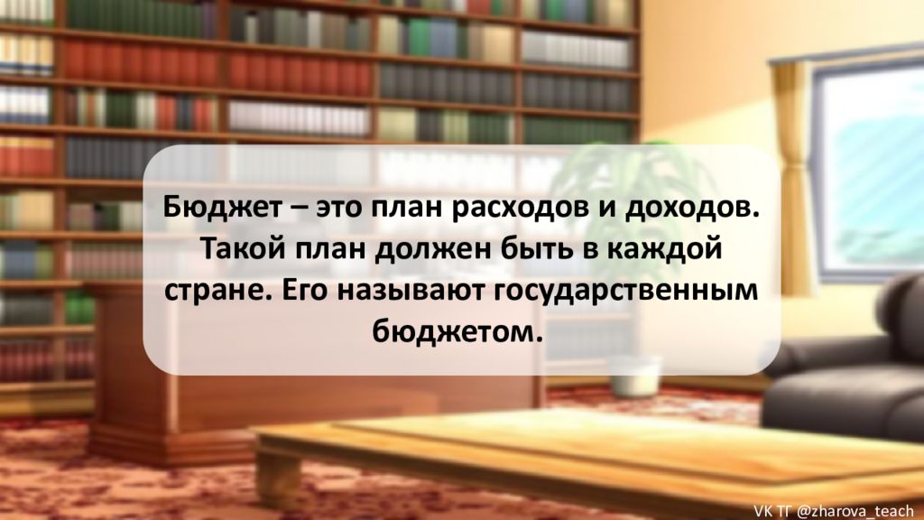 Бюджет – это план расходов и доходов. Такой план должен быть в каждой стране. Его называют государственным бюджетом. VK ТГ @zharova _ teach