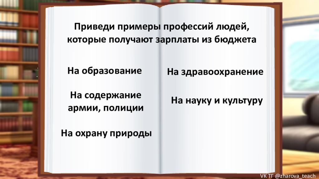 Приведи примеры профессий людей, которые получают зарплаты из бюджета На образование На здравоохранение На содержание армии, полиции На науку и культуру На охрану природы VK ТГ @zharova _ teach