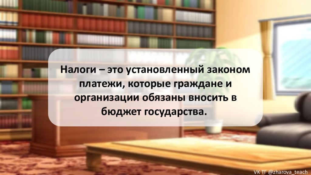 Налоги – это установленный законом платежи, которые граждане и организации обязаны вносить в бюджет государства. VK ТГ @zharova _ teach