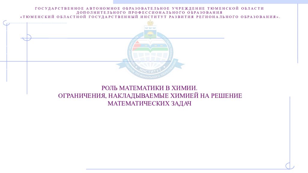 ГОСУДАРСТВЕННОЕ АВТОНОМНОЕ ОБРАЗОВАТЕЛЬНОЕ УЧРЕЖДЕНИЕ ТЮМЕНСКОЙ ОБЛАСТИ ДОПОЛНИТЕЛЬНОГО ПРОФЕССИОНАЛЬНОГО ОБРАЗОВАНИЯ «ТЮМЕНСКИЙ ОБЛАСТНОЙ ГОСУДАРСТВЕННЫЙ ИНСТИТУТ РАЗВИТИЯ РЕГИОНАЛЬНОГО ОБРАЗОВАНИЯ». РОЛЬ МАТЕМАТИКИ В ХИМИИ. ОГРАНИЧЕНИЯ, НАКЛАДЫВАЕМЫЕ ХИМИЕЙ НА РЕШЕНИЕ МАТЕМАТИЧЕСКИХ ЗАДАЧ