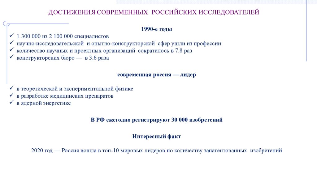 1990-е годы 1 300 000 из 2 100 000 специалистов научно-исследовательской и опытно-конструкторской сфер ушли из профессии количество научных и проектных организаций сократилось в 7.8 раз конструкторских бюро — в 3.6 раза современная россия — лидер в теоретической и экспериментальной физике в разработке медицинских препаратов в ядерной энергетике В РФ ежегодно регистрируют 30 000 изобретений Интересный факт 2020 год — Россия вошла в топ-10 мировых лидеров по количеству запатентованных изобретений ДОСТИЖЕНИЯ СОВРЕМЕННЫХ РОССИЙСКИХ ИССЛЕДОВАТЕЛЕЙ