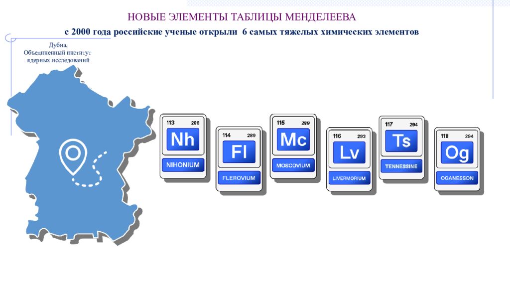 НОВЫЕ ЭЛЕМЕНТЫ ТАБЛИЦЫ МЕНДЕЛЕЕВА c 2000 года российские ученые открыли 6 самых тяжелых химических элементов Дубна, Объединенный институт ядерных исследований
