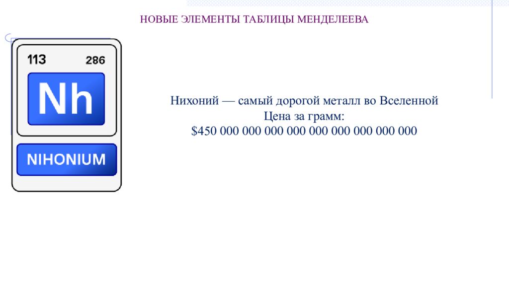 НОВЫЕ ЭЛЕМЕНТЫ ТАБЛИЦЫ МЕНДЕЛЕЕВА Нихоний — самый дорогой металл во Вселенной Цена за грамм: $450 000 000 000 000 000 000 000 000 000