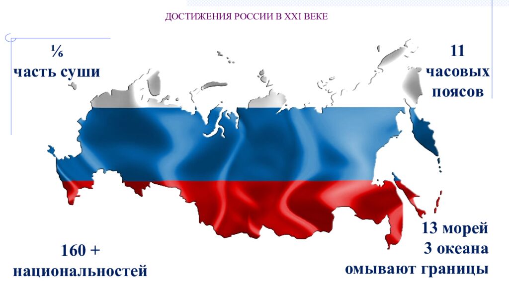 160 + национальностей 13 морей 3 океана омывают границы 11 часовых поясов ДОСТИЖЕНИЯ РОССИИ В XXI ВЕКЕ