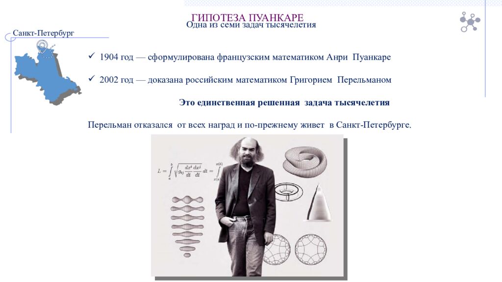 Одна из семи задач тысячелетия Санкт-Петербург 1904 год — сформулирована французским математиком Анри Пуанкаре 2002 год — доказана российским математиком Григорием Перельманом Это единственная решенная задача тысячелетия Перельман отказался от всех наград и по-прежнему живет в Санкт-Петербурге.