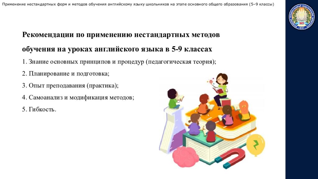 Применение нестандартных форм и методов обучения английскому языку школьников на этапе основного общего образования (5–9 классы) Рекомендации по применению нестандартных методов обучения на уроках английского языка в 5-9 классах 1. Знание основных принципов и процедур (педагогическая теория); 2. Планирование и подготовка; 3. Опыт преподавания (практика); 4. Самоанализ и модификация методов; 5. Гибкость.