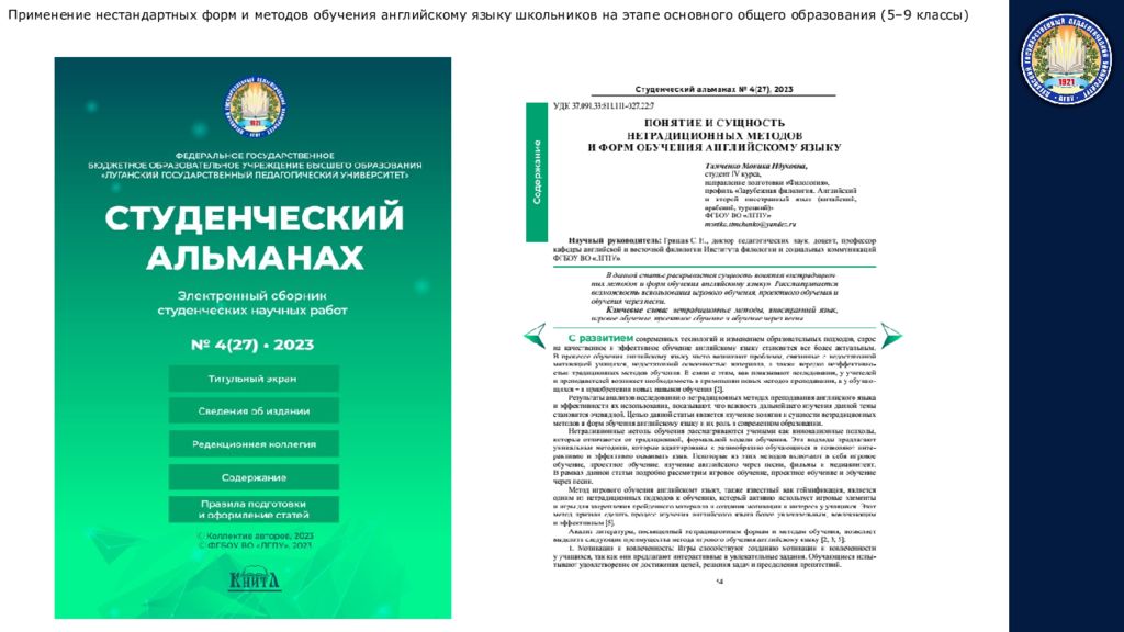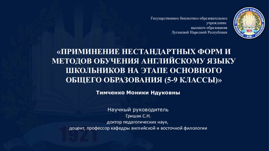 Государственное бюджетное образовательное учреждение высшего образования Луганской Народной Республики «ПРИМИНЕНИЕ НЕСТАНДАРТНЫХ ФОРМ И МЕТОДОВ ОБУЧЕНИЯ АНГЛИЙСКОМУ ЯЗЫКУ ШКОЛЬНИКОВ НА ЭТАПЕ ОСНОВНОГО ОБЩЕГО ОБРАЗОВАНИЯ (5-9 КЛАССЫ)» Тимченко Моники Ндуковны Научный руководитель Гришак С.Н. доктор педагогических наук, доцент, профессор кафедры английской и восточной филологии