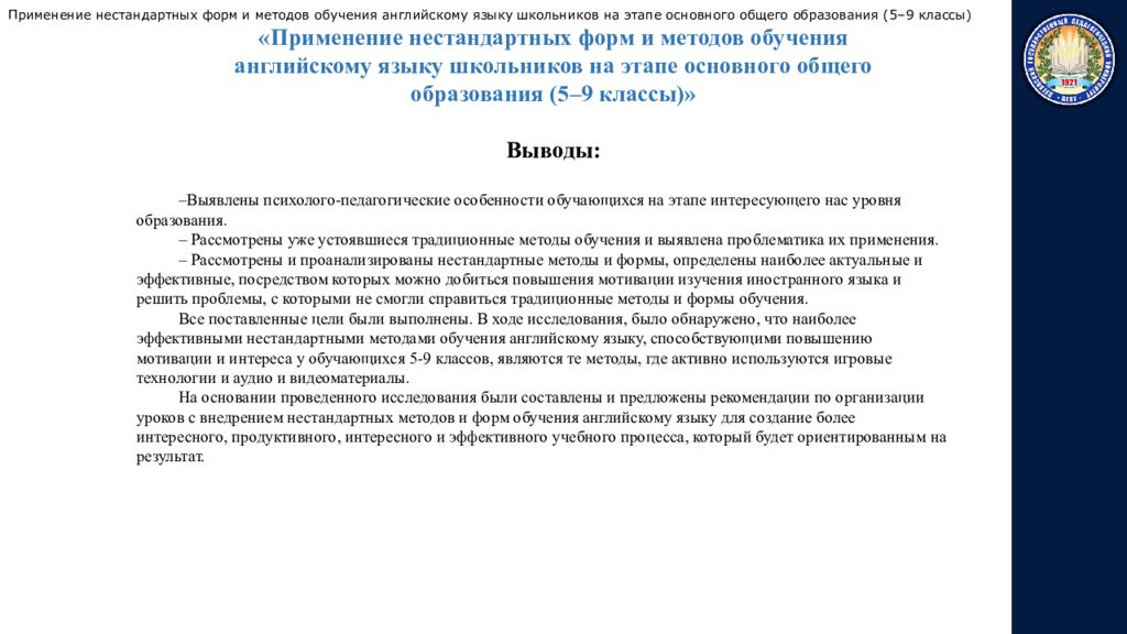 Применение нестандартных форм и методов обучения английскому языку школьников на этапе основного общего образования (5–9 классы) «Применение нетрадиционных форм и методов обучения английскому языку школьников на этапе основного общего образования (5–9 классы)» «Применение нестандартных форм и методов обучения английскому языку школьников на этапе основного общего образования (5–9 классы)» Выводы: –Выявлены психолого-педагогические особенности обучающихся на этапе интересующего нас уровня образования. – Рассмотрены уже устоявшиеся традиционные методы обучения и выявлена проблематика их применения. – Рассмотрены и проанализированы нестандартные методы и формы, определены наиболее актуальные и эффективные, посредством которых можно добиться повышения мотивации изучения иностранного языка и решить проблемы, с которыми не смогли справиться традиционные методы и формы обучения. Все поставленные цели были выполнены. В ходе исследования, было обнаружено, что наиболее эффективными нестандартными методами обучения английскому языку, способствующими повышению мотивации и интереса у обучающихся 5-9 классов, являются те методы, где активно используются игровые технологии и аудио и видеоматериалы. На основании проведенного исследования были составлены и предложены рекомендации по организации уроков с внедрением нестандартных методов и форм обучения английскому языку для создание более интересного, продуктивного, интересного и эффективного учебного процесса, который будет ориентированным на результат.