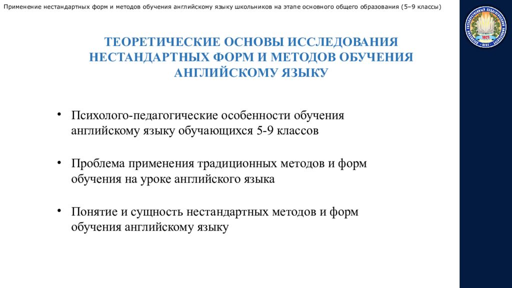 Применение нестандартных форм и методов обучения английскому языку школьников на этапе основного общего образования (5–9 классы) ТЕОРЕТИЧЕСКИЕ ОСНОВЫ ИССЛЕДОВАНИЯ НЕСТАНДАРТНЫХ ФОРМ И МЕТОДОВ ОБУЧЕНИЯ АНГЛИЙСКОМУ ЯЗЫКУ Психолого-педагогические особенности обучения английскому языку обучающихся 5-9 классов Проблема применения традиционных методов и форм обучения на уроке английского языка Понятие и сущность нестандартных методов и форм обучения английскому языку