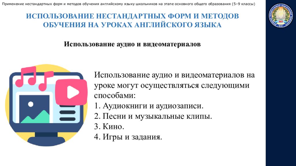 Применение нестандартных форм и методов обучения английскому языку школьников на этапе основного общего образования (5–9 классы) ИСПОЛЬЗОВАНИЕ НЕСТАНДАРТНЫХ ФОРМ И МЕТОДОВ ОБУЧЕНИЯ НА УРОКАХ АНГЛИЙСКОГО ЯЗЫКА Использование аудио и видеоматериалов Использование аудио и видеоматериалов на уроке могут осуществляться следующими способами: 1. Аудиокниги и аудиозаписи. 2. Песни и музыкальные клипы. 3. Кино. 4. Игры и задания.