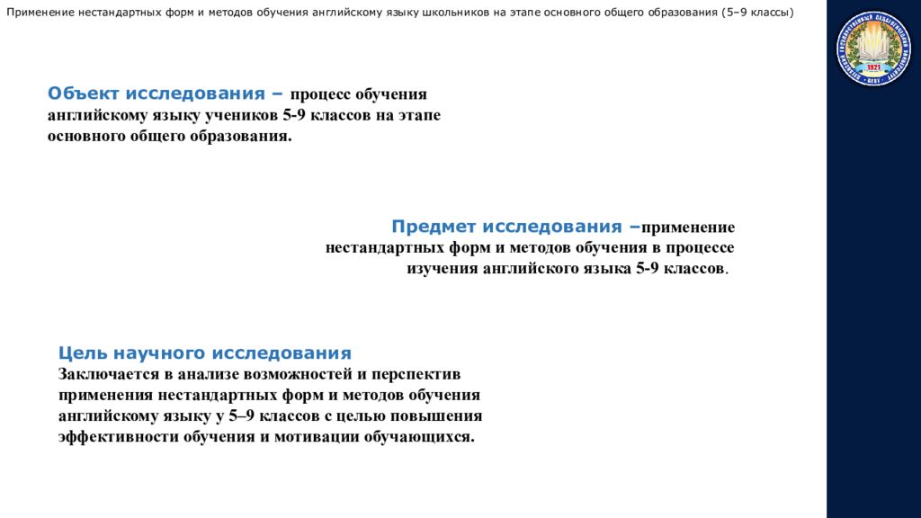 Применение нестандартных форм и методов обучения английскому языку школьников на этапе основного общего образования (5–9 классы) Объект исследования – процесс обучения английскому языку учеников 5-9 классов на этапе основного общего образования. Предмет исследования – применение нестандартных форм и методов обучения в процессе изучения английского языка 5-9 классов. Цель научного исследования Заключается в анализе возможностей и перспектив применения нестандартных форм и методов обучения английскому языку у 5–9 классов с целью повышения эффективности обучения и мотивации обучающихся.