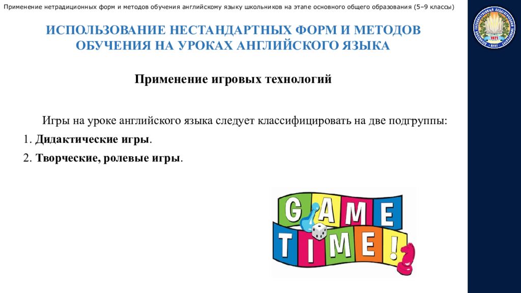 Применение нетрадиционных форм и методов обучения английскому языку школьников на этапе основного общего образования (5–9 классы) ИСПОЛЬЗОВАНИЕ НЕСТАНДАРТНЫХ ФОРМ И МЕТОДОВ ОБУЧЕНИЯ НА УРОКАХ АНГЛИЙСКОГО ЯЗЫКА Применение игровых технологий Игры на уроке английского языка следует классифицировать на две подгруппы: 1. Дидактические игры. 2. Творческие, ролевые игры.