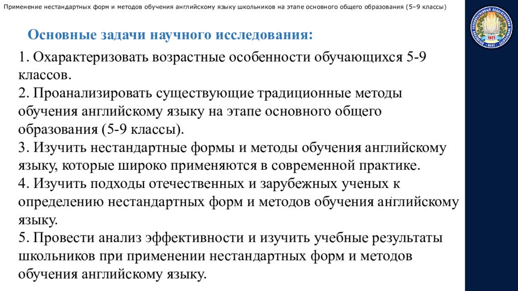 Применение нестандартных форм и методов обучения английскому языку школьников на этапе основного общего образования (5–9 классы) . 1. Охарактеризовать возрастные особенности обучающихся 5-9 классов. 2. Проанализировать существующие традиционные методы обучения английскому языку на этапе основного общего образования (5-9 классы). 3. Изучить нестандартные формы и методы обучения английскому языку, которые широко применяются в современной практике. 4. Изучить подходы отечественных и зарубежных ученых к определению нестандартных форм и методов обучения английскому языку. 5. Провести анализ эффективности и изучить учебные результаты школьников при применении нестандартных форм и методов обучения английскому языку. Основные задачи научного исследования: