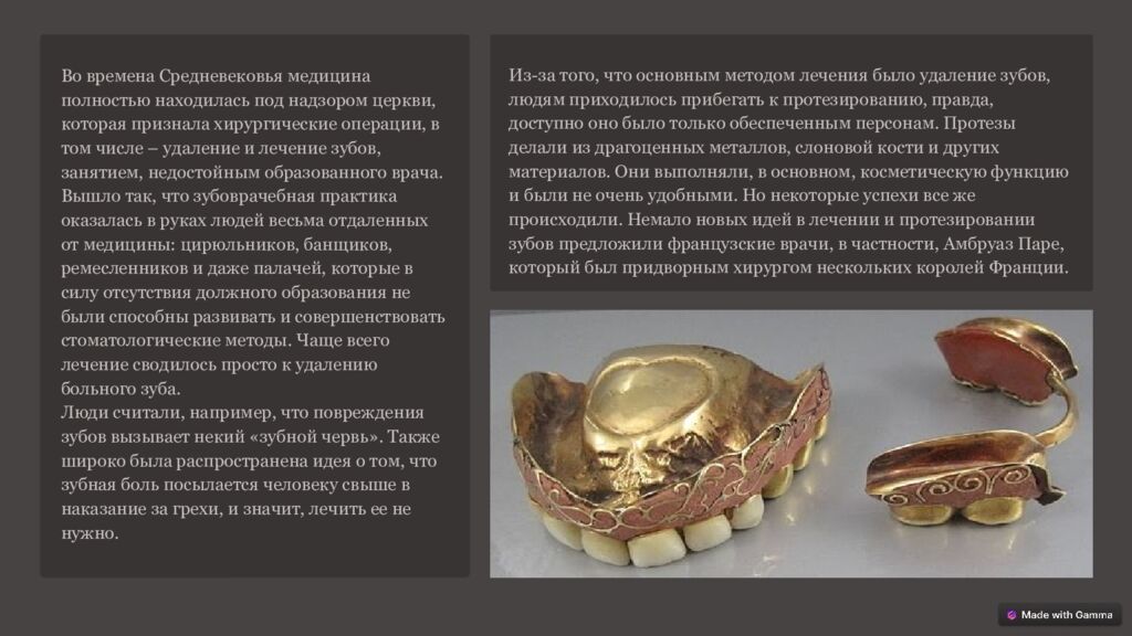 Во времена Средневековья медицина полностью находилась под надзором церкви, которая признала хирургические операции, в том числе – удаление и лечение зубов, занятием, недостойным образованного врача. Вышло так, что зубоврачебная практика оказалась в руках людей весьма отдаленных от медицины: цирюльников, банщиков, ремесленников и даже палачей, которые в силу отсутствия должного образования не были способны развивать и совершенствовать стоматологические методы. Чаще всего лечение сводилось просто к удалению больного зуба. Люди считали, например, что повреждения зубов вызывает некий «зубной червь». Также широко была распространена идея о том, что зубная боль посылается человеку свыше в наказание за грехи, и значит, лечить ее не нужно. Из-за того, что основным методом лечения было удаление зубов, людям приходилось прибегать к протезированию, правда, доступно оно было только обеспеченным персонам. Протезы делали из драгоценных металлов, слоновой кости и других материалов. Они выполняли, в основном, косметическую функцию и были не очень удобными. Но некоторые успехи все же происходили. Немало новых идей в лечении и протезировании зубов предложили французские врачи, в частности, Амбруаз Паре, который был придворным хирургом нескольких королей Франции.