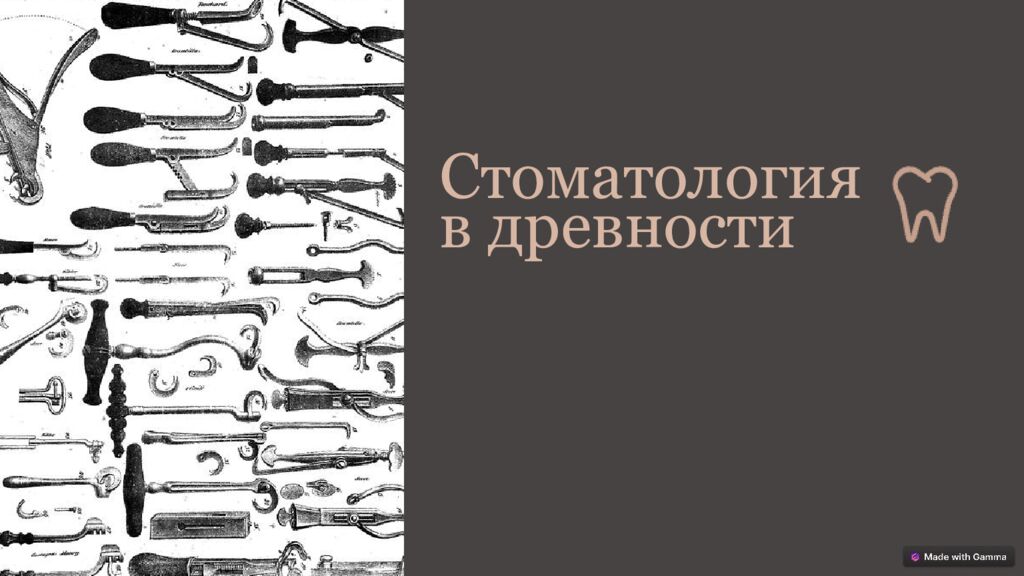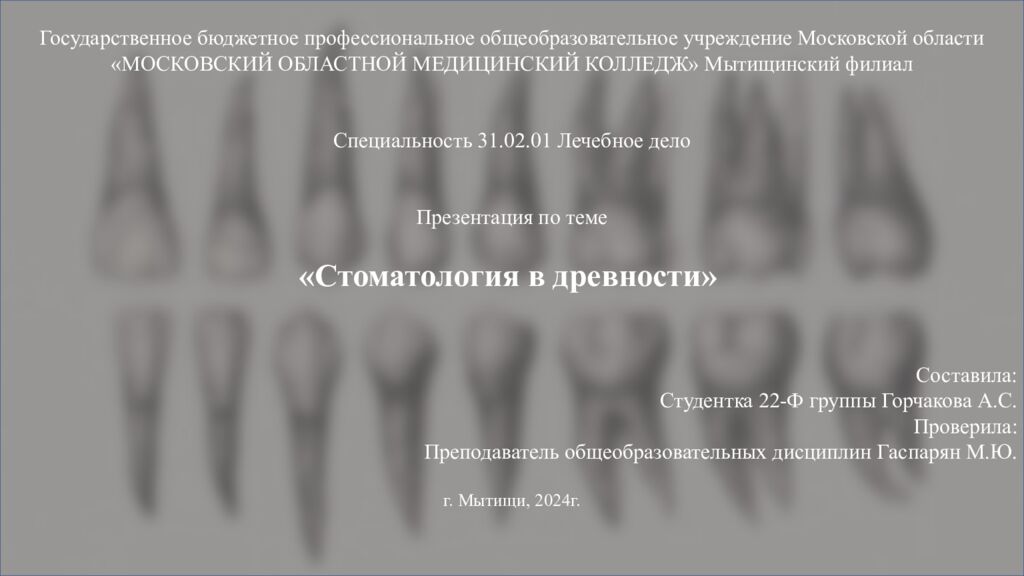 Государственное бюджетное профессиональное общеобразовательное учреждение Московской области «МОСКОВСКИЙ ОБЛАСТНОЙ МЕДИЦИНСКИЙ КОЛЛЕДЖ» Мытищинский филиал Специальность 31.02.01 Лечебное дело Презентация по теме «Стоматология в древности» Составила: Студентка 22-Ф группы Горчакова А.С. Проверила: Преподаватель общеобразовательных дисциплин Гаспарян М.Ю. г. Мытищи, 2024г.