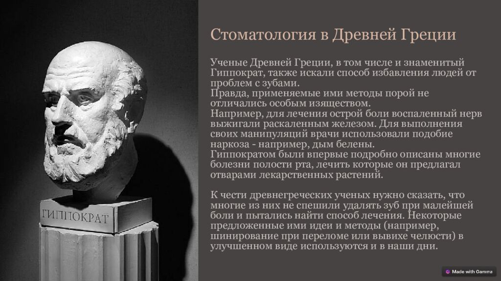 Стоматология в Древней Греции Ученые Древней Греции, в том числе и знаменитый Гиппократ, также искали способ избавления людей от проблем с зубами. Правда, применяемые ими методы порой не отличались особым изяществом. Например, для лечения острой боли воспаленный нерв выжигали раскаленным железом. Для выполнения своих манипуляций врачи использовали подобие наркоза - например, дым белены. Гиппократом были впервые подробно описаны многие болезни полости рта, лечить которые он предлагал отварами лекарственных растений. К чести древнегреческих ученых нужно сказать, что многие из них не спешили удалять зуб при малейшей боли и пытались найти способ лечения. Некоторые предложенные ими идеи и методы (например, шинирование при переломе или вывихе челюсти) в улучшенном виде используются и в наши дни.