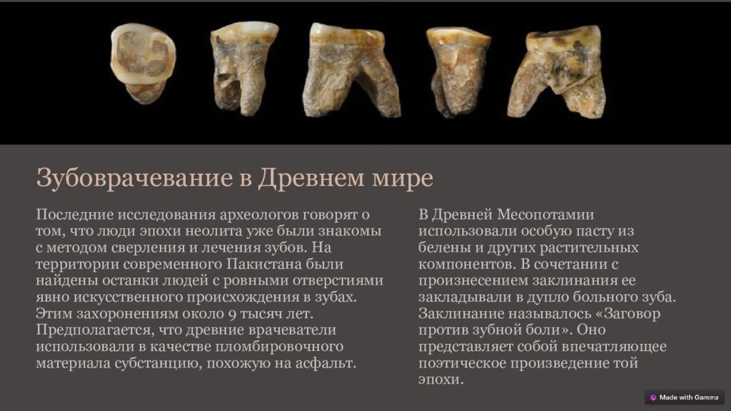 Зубоврачевание в Древнем мире П оследние исследования археологов говорят о том, что люди эпохи неолита уже были знакомы с методом сверления и лечения зубов. На территории современного Пакистана были найдены останки людей с ровными отверстиями явно искусственного происхождения в зубах. Этим захоронениям около 9 тысяч лет. Предполагается, что древние врачеватели использовали в качестве пломбировочного материала субстанцию, похожую на асфальт. В Древней Месопотамии использовали особую пасту из белены и других растительных компонентов. В сочетании с произнесением заклинания ее закладывали в дупло больного зуба. Заклинание называлось «Заговор против зубной боли». Оно представляет собой впечатляющее поэтическое произведение той эпохи.