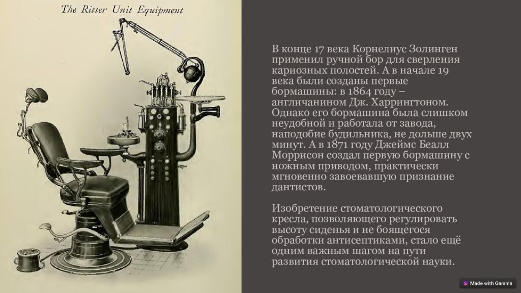 В конце 17 века Корнелиус Золинген применил ручной бор для сверления кариозных полостей. А в начале 19 века были созданы первые бормашины: в 1864 году – англичанином Дж. Харрингтоном. Однако его бормашина была слишком неудобной и работала от завода, наподобие будильника, не дольше двух минут. А в 1871 году Джеймс Беалл Моррисон создал первую бормашину с ножным приводом, практически мгновенно завоевавшую признание дантистов. Изобретение стоматологического кресла, позволяющего регулировать высоту сиденья и не боящегося обработки антисептиками, стало ещё одним важным шагом на пути развития стоматологической науки.